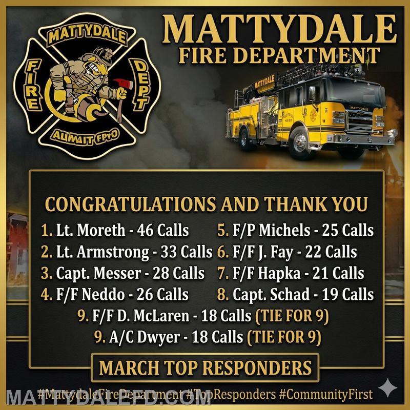 The Mattydale Fire Department would like to recognize our Top Responders for March for their outstanding commitment and service to our community. Your dedication, reliability, and willingness to answer every call make a direct impact on the safety of those we serve.